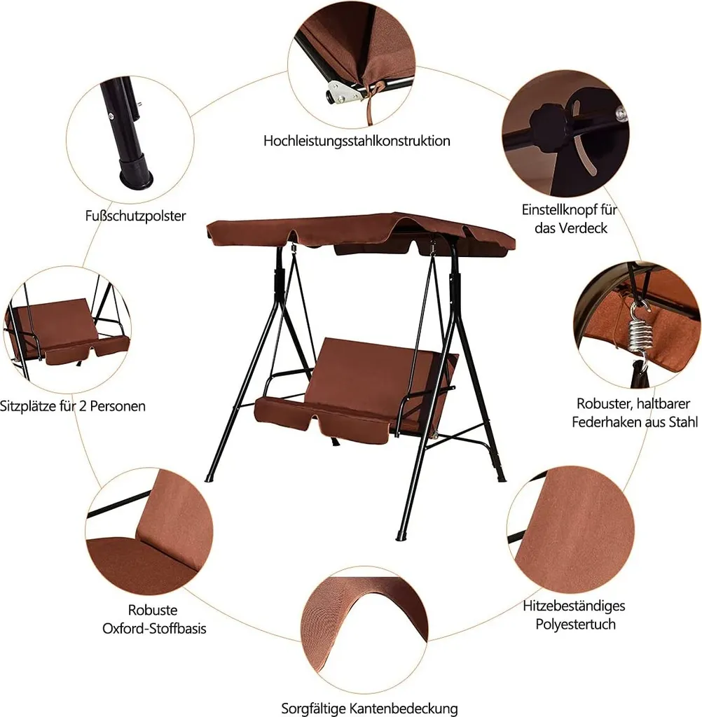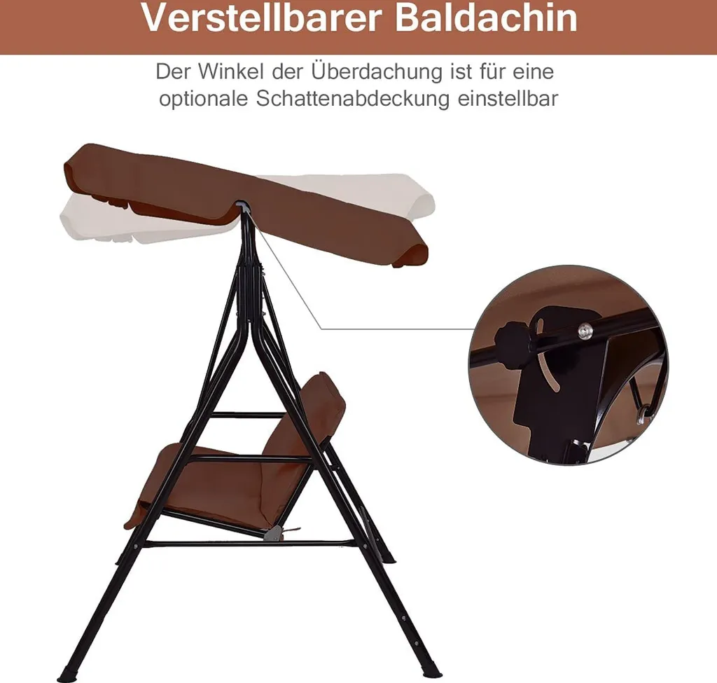 COSTWAY 2-Sitzer Hollywoodschaukel Mit Sonnendach Gartenschaukel Gartenliege Schaukel Schaukelbank Gartenbank Braun