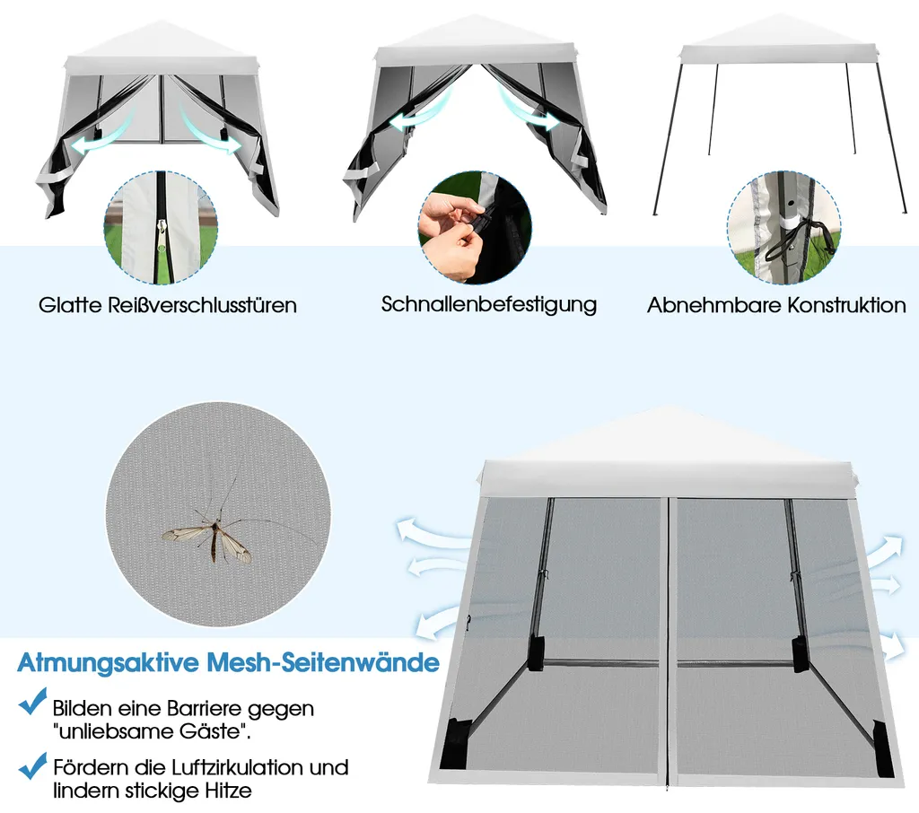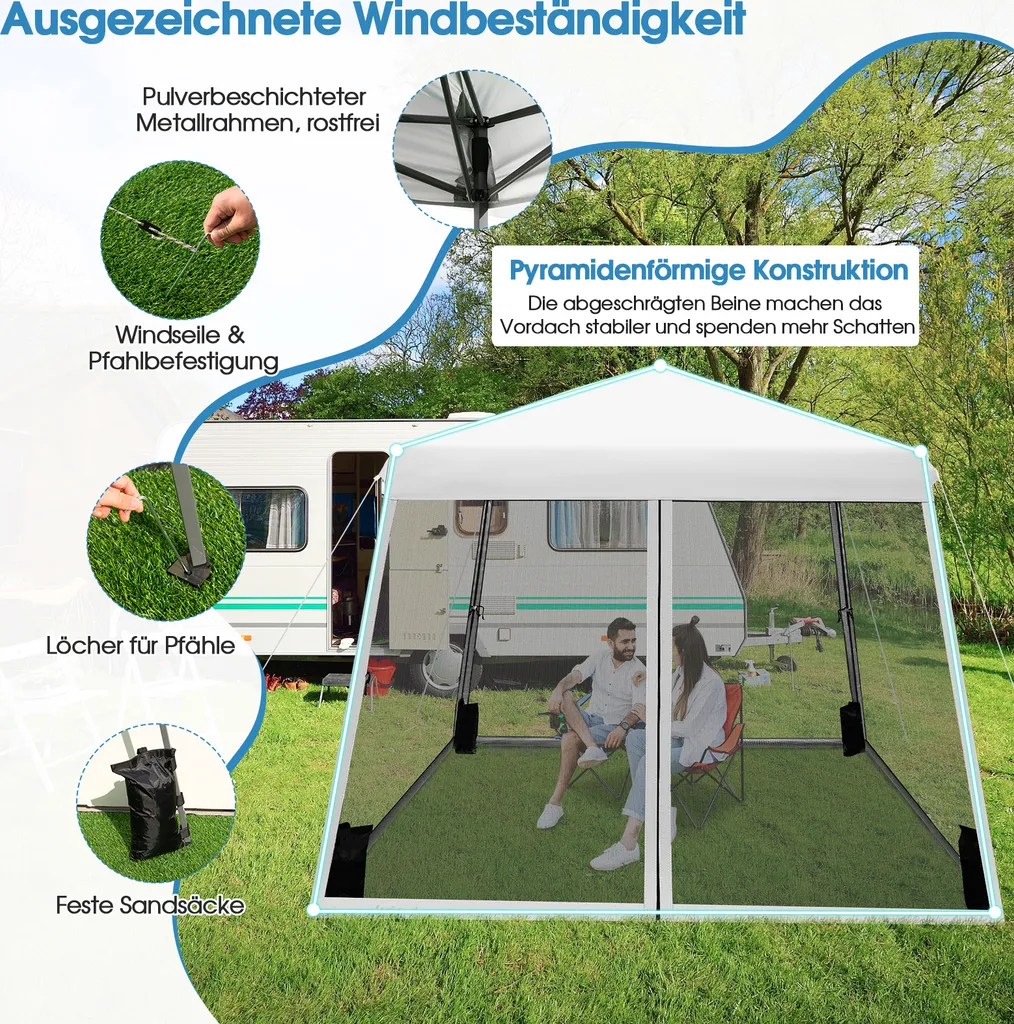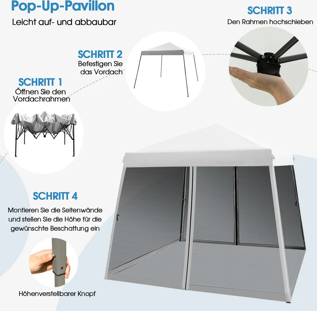 COSTWAY 3×3 M Pop Up Pavillon Mit Moskitonetz Und Sandsäcke, Faltpavillon Faltbar, UV-Schutz 50+, Gartenzelt Partyzelt Stabil, Gartenpavillon Für Garten, Inkl. Rolltasche (Weiß)