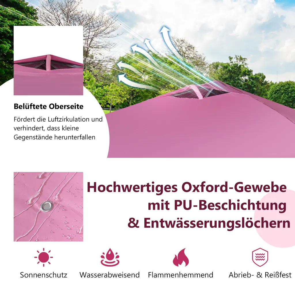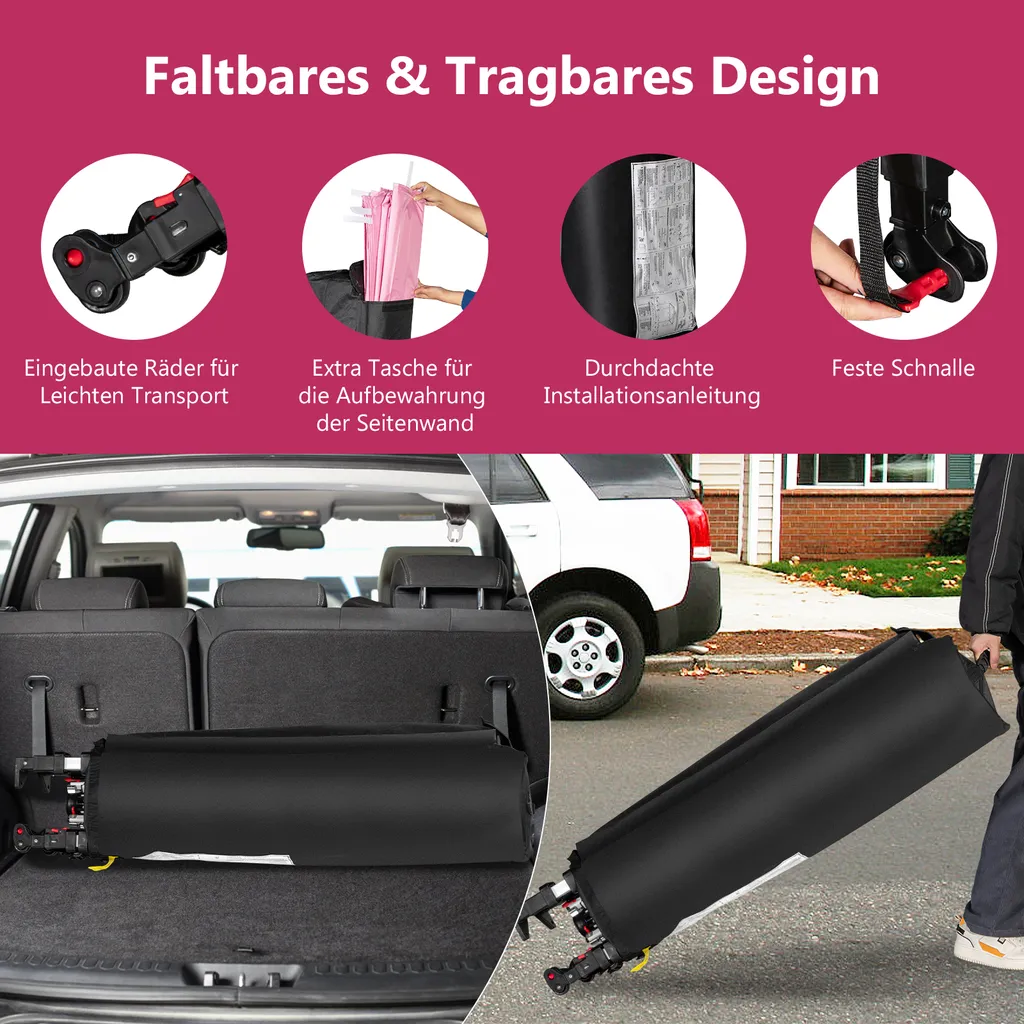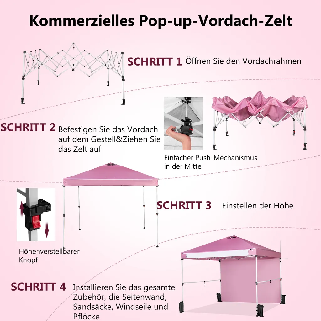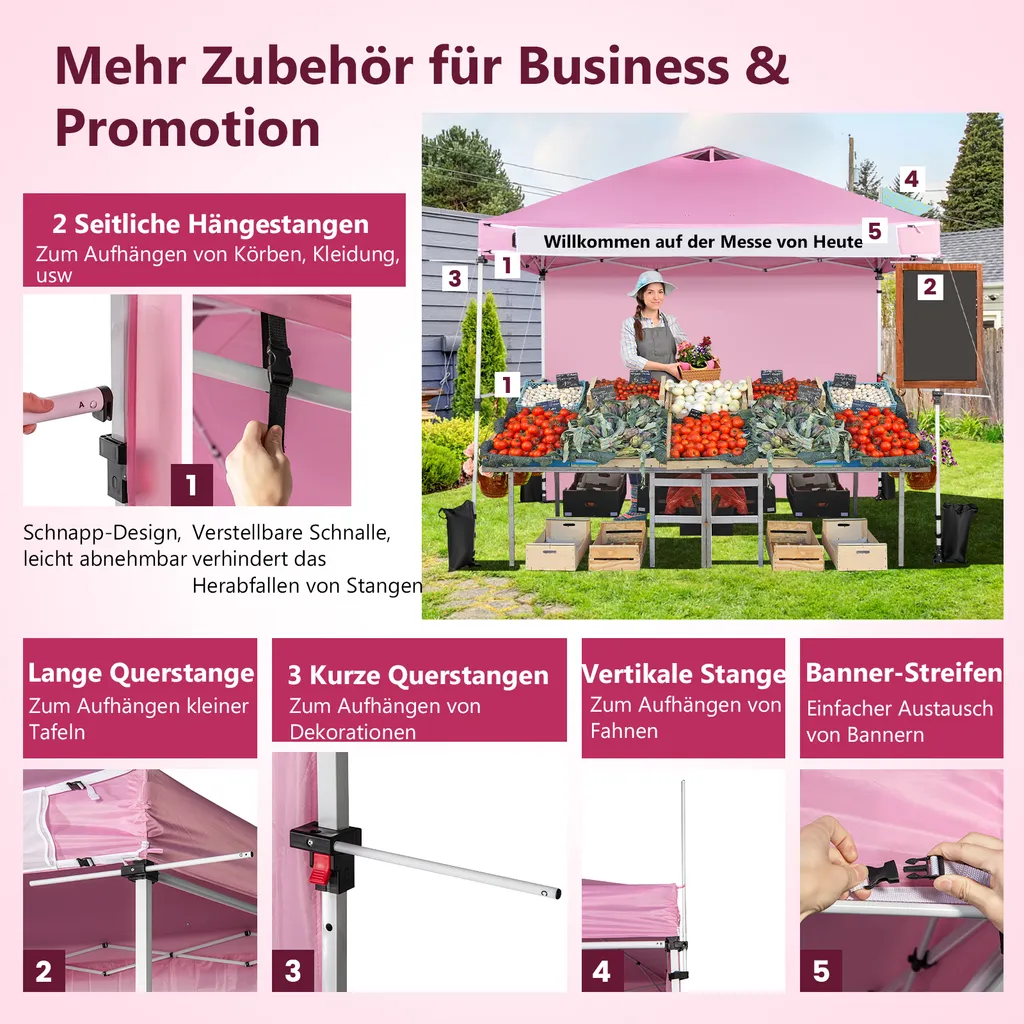 COSTWAY 3x3m Pop Up Pavillon Mit Seitenwand, Faltbarer Gartenpavillon Mit Hängenden Querstangen, Bannerstreifen & Rolltasche, UV-Schutz 50+, Tragbarer Faltpavillon Für Markt, Terrasse, Camping (Rosa)