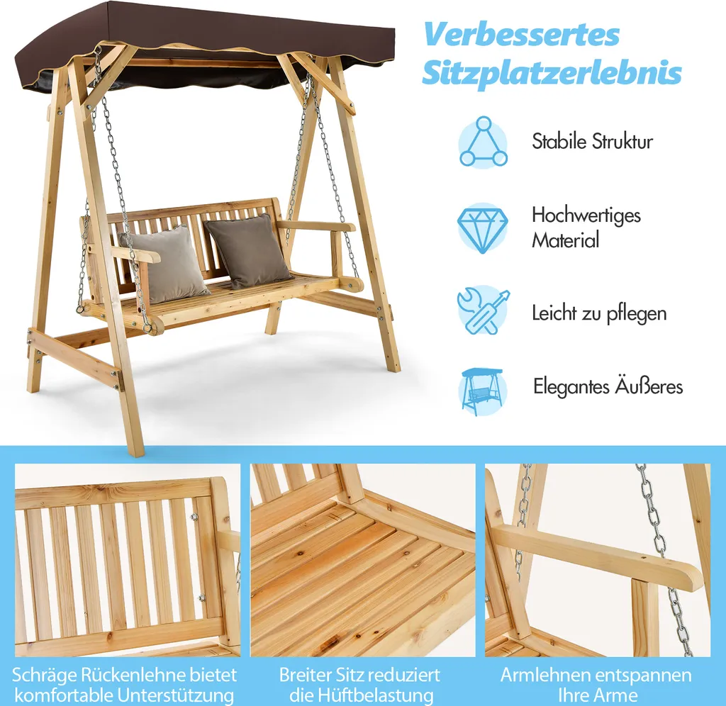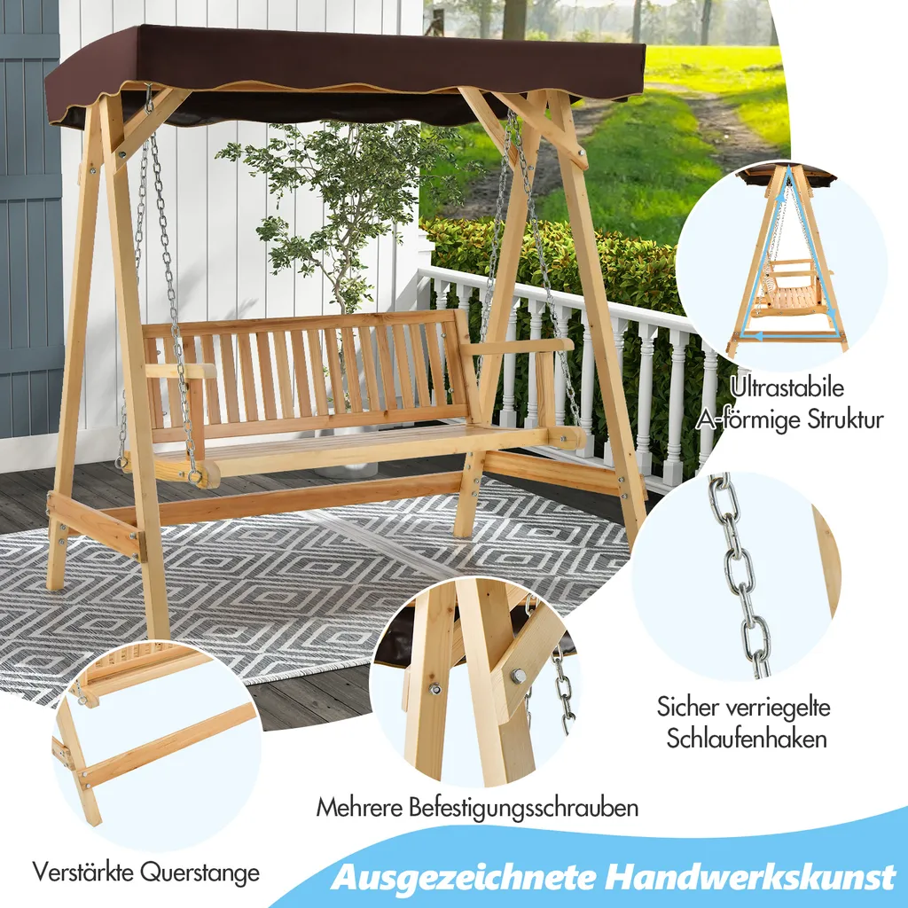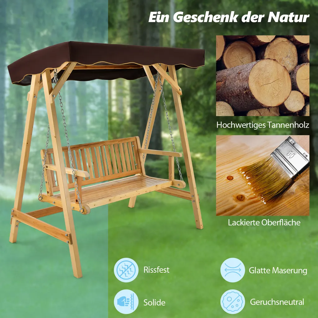 COSTWAY Hollywoodschaukel Aus Holz, 2-Sitzer, Gartenschaukel Mit Verstellbarem Sonnendach & Metallkette, Schaukelbank Bis 240kg Belastbar Für Veranda, Hinterhof, Pool