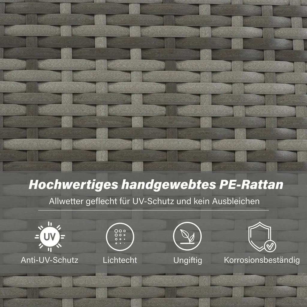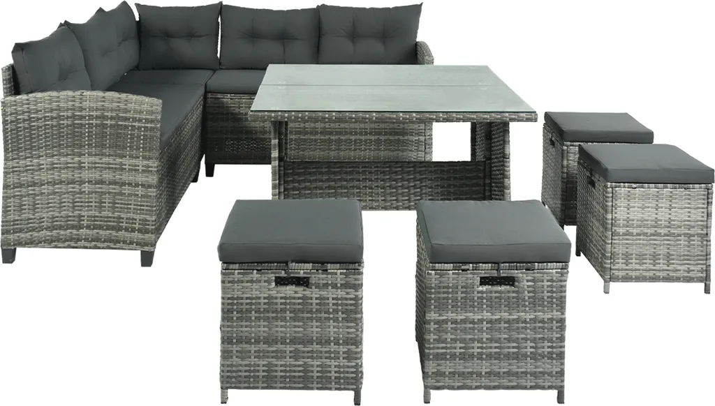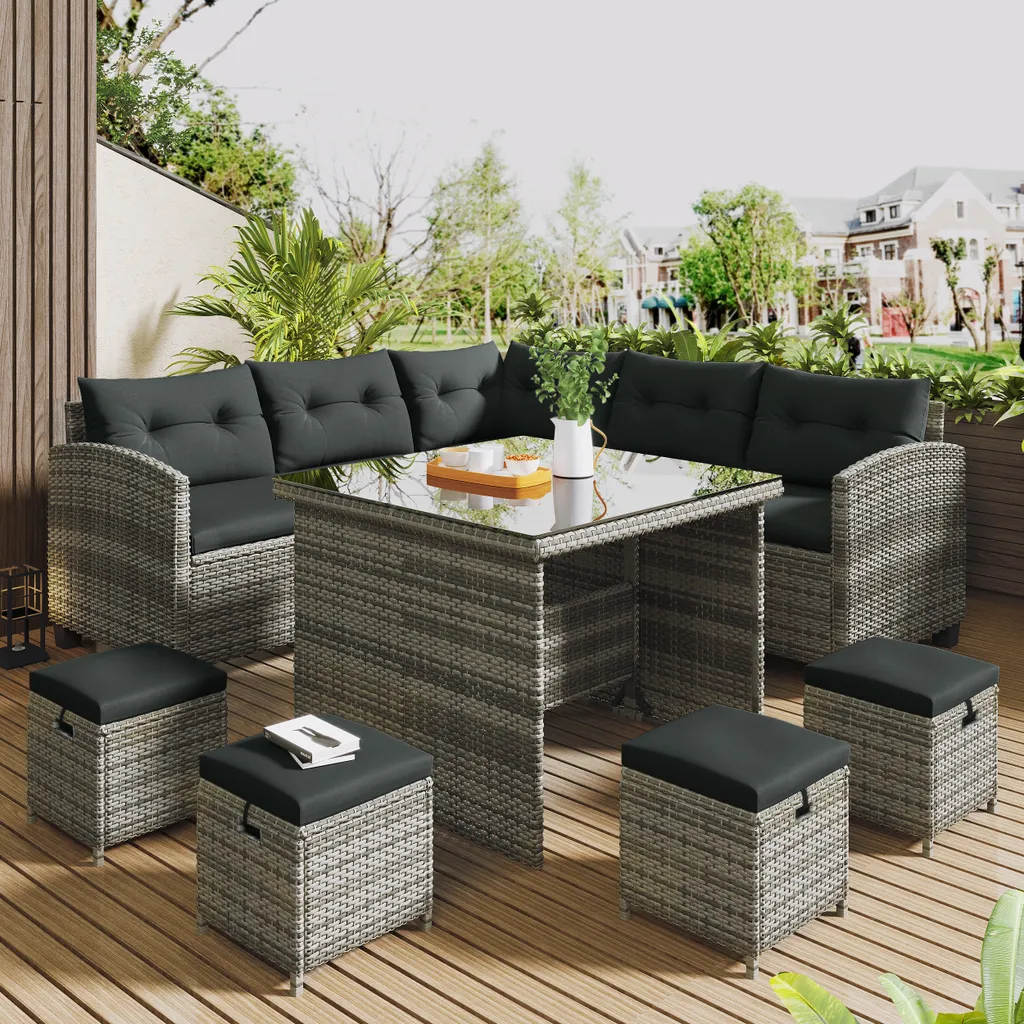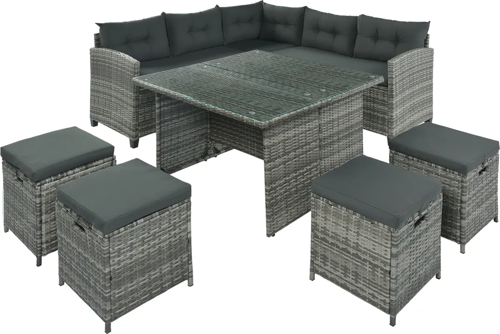 Merax Gartenlounge-Set Polyrattan Lounge Für 9 Personen, 5er Ecksofa, 1xTisch Mit Glas, 4x Hocker Mit Kissen, Gartenmöbel Set Balkonset, Grau