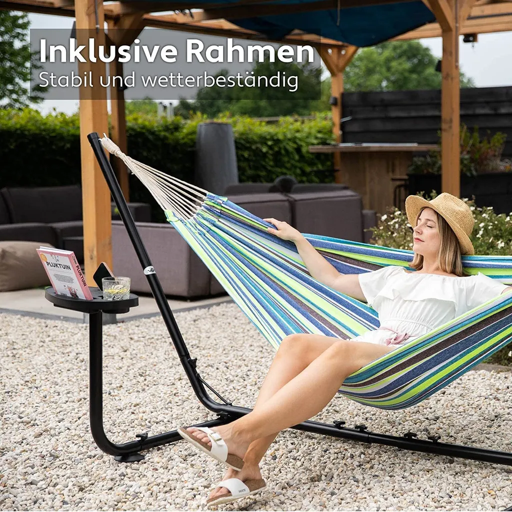 VITA5 Hängematte Mit Gestell Outdoor – Hängematte 2 Personen Für Garten & Balkon – Doppelhängematte Mit Getränkehalter- Tragbare Hängematte 200kg Belastbarkeit (Grün/Blau Cupholder)